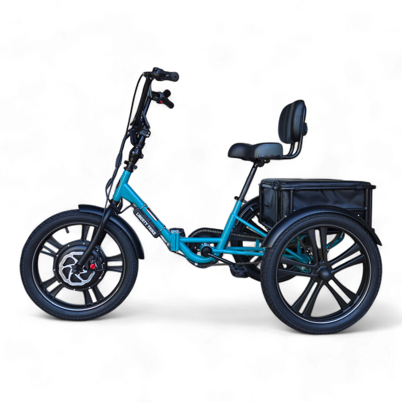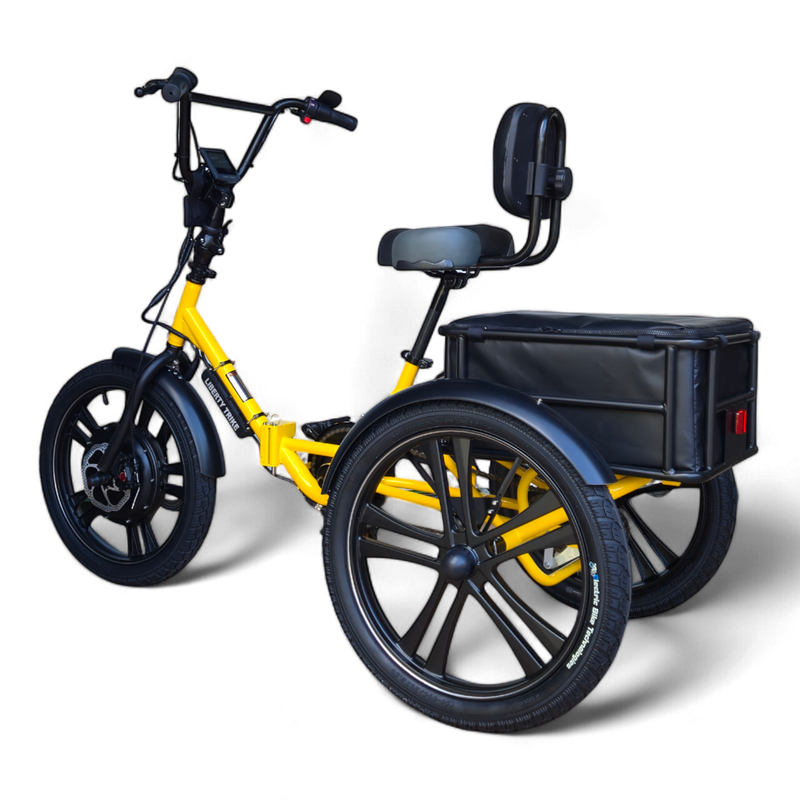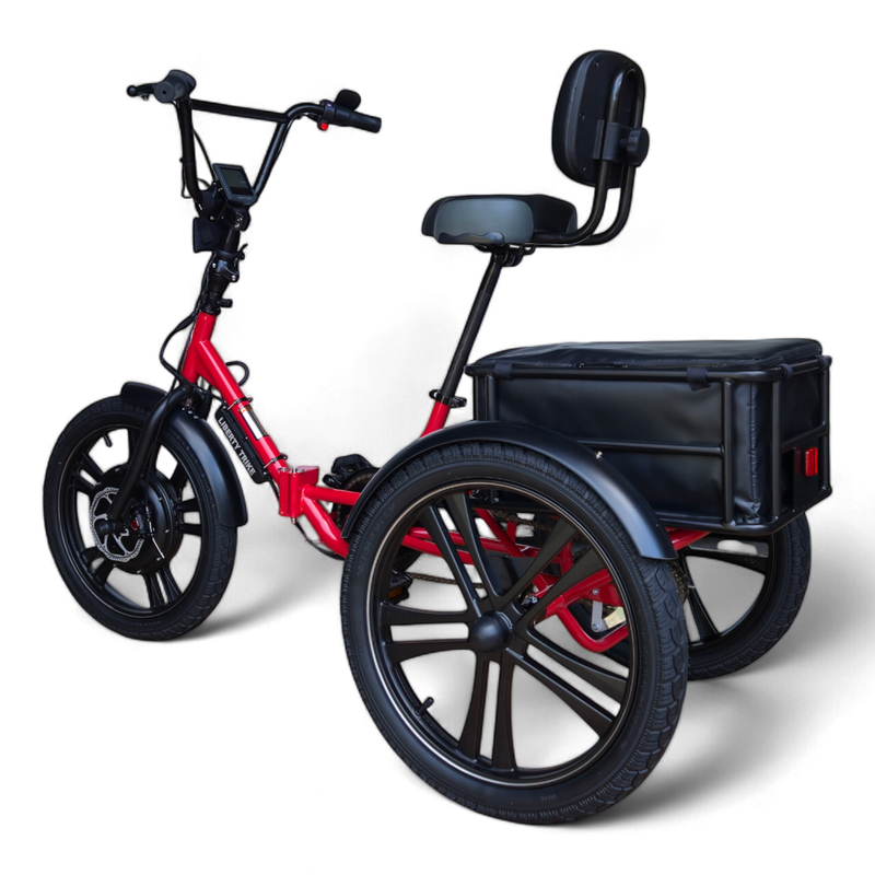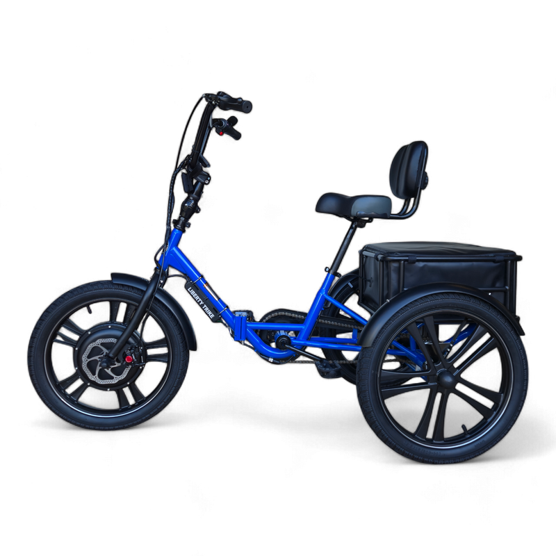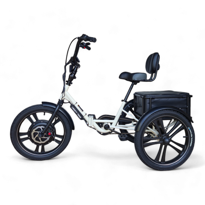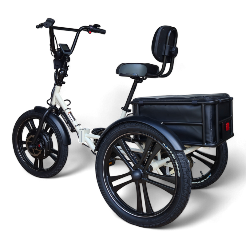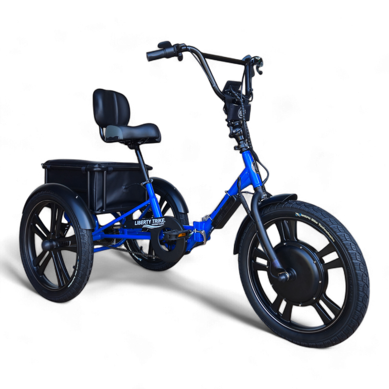 The Liberty Trike is perfect for those who want the freedom to move actively or effortlessly on three wheels. Its compact, foldable design makes it easy to store, transport, and navigate through tight spaces. Equipped with a powerful 750W direct-drive motor and durable hydraulic brakes, the Liberty Trike handles various terrains and moderate inclines with ease. The patent-pending folding system allows the trike to nest compactly, while the adjustable rear basket and Liberty Lever throttle provide comfort, convenience, and maximum control. Whether you're exploring new places or running errands, the Liberty Trike delivers portability, power, and reliability for everyday use.